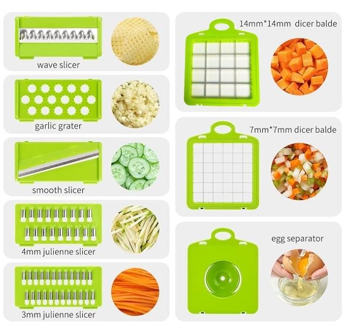 ✅ 8 شفرات متنوعة – تتيح لك تقطيع الخضار والفواكه بأشكال وأحجام مختلفة بسرعة و سهولة.